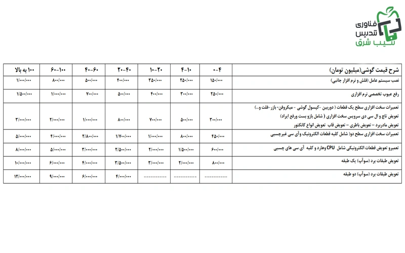 Toggleجدول مقایسه هزینه تعمیر گوشی بر اساس نرخنامه 1404
